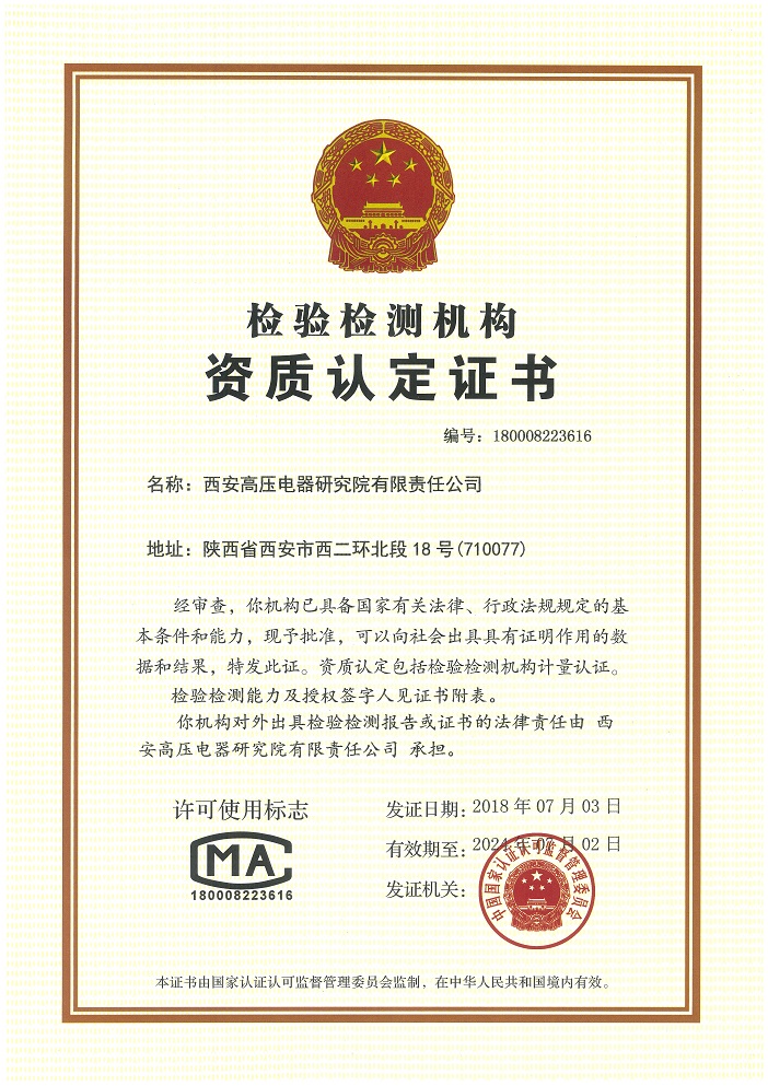 “西安高压电器研究院股份有限公司”陕西省资质认定证书