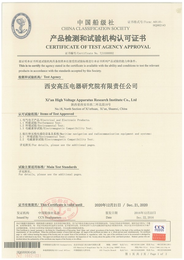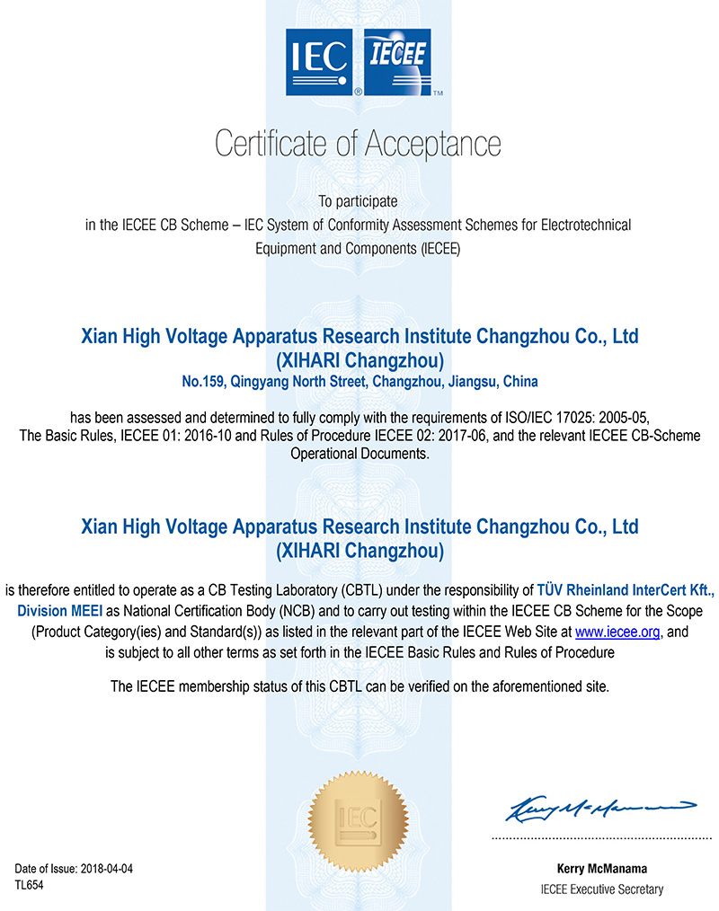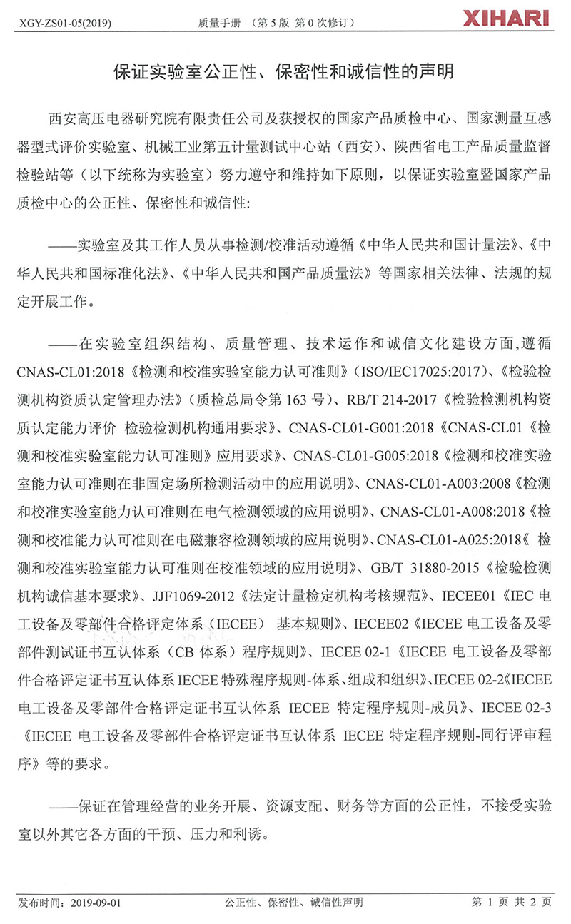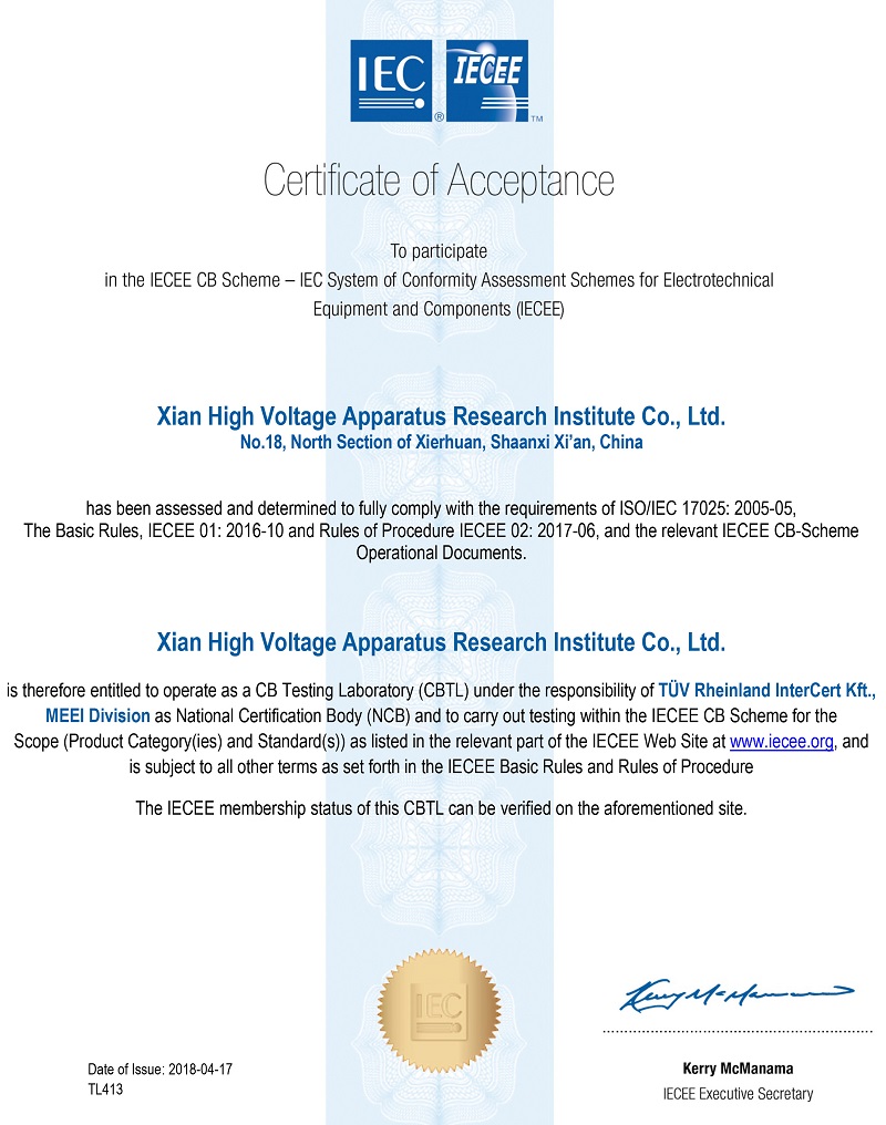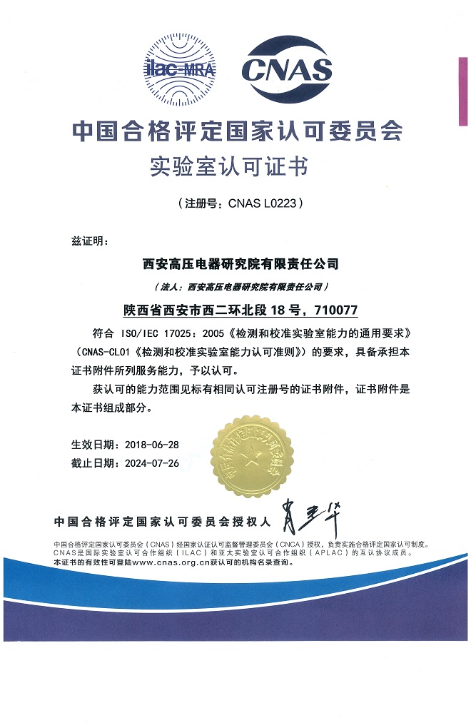 “西安高压电器研究院股份有限公司”实验室认可证书