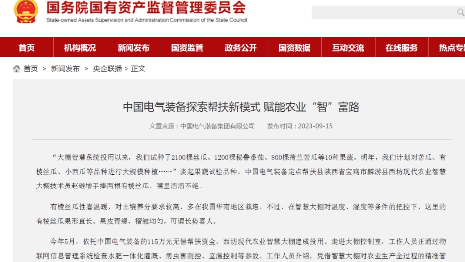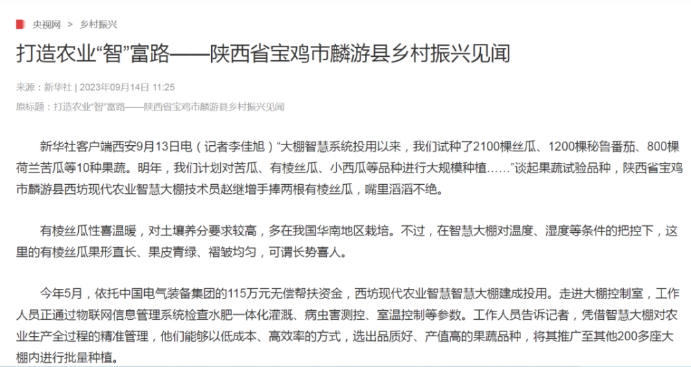连日来,介绍中国电气装备定点帮扶项目成效的报道《打造农业“智”富路——陕西省宝鸡市麟游县乡村振兴见闻》备受多家主流媒体关注,一起来看看那些被“聚焦”的时刻!
