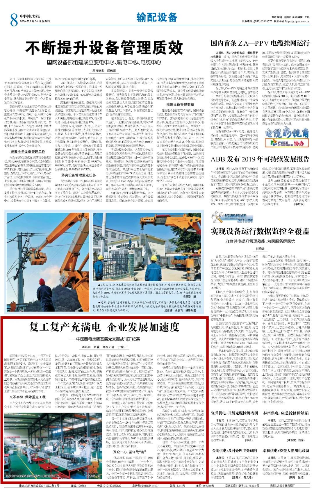 近日,中国电力报刊登了《复工复产充满电 企业发展加速度——中国西电集团基层党支部复产复工战“疫”纪实》一文,文章展示了中国西电集团基层党支部积极响应企业党委号召,以“满格电”开启“复工键”,勇挑重担,尽现担当作为的先锋本色。