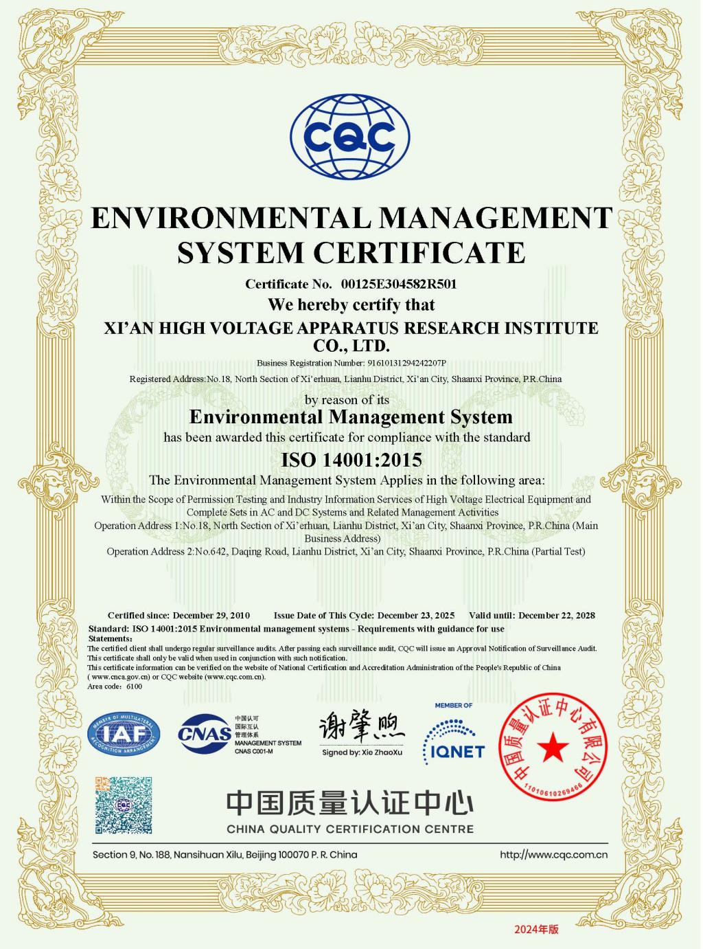 “西安高压电器研究院股份有限公司”环境管理体系认证证书