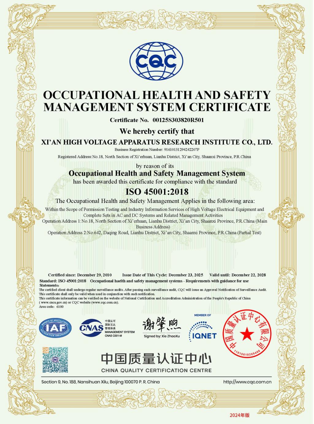 “西安高压电器研究院股份有限公司”职业健康安全管理体系认证证书