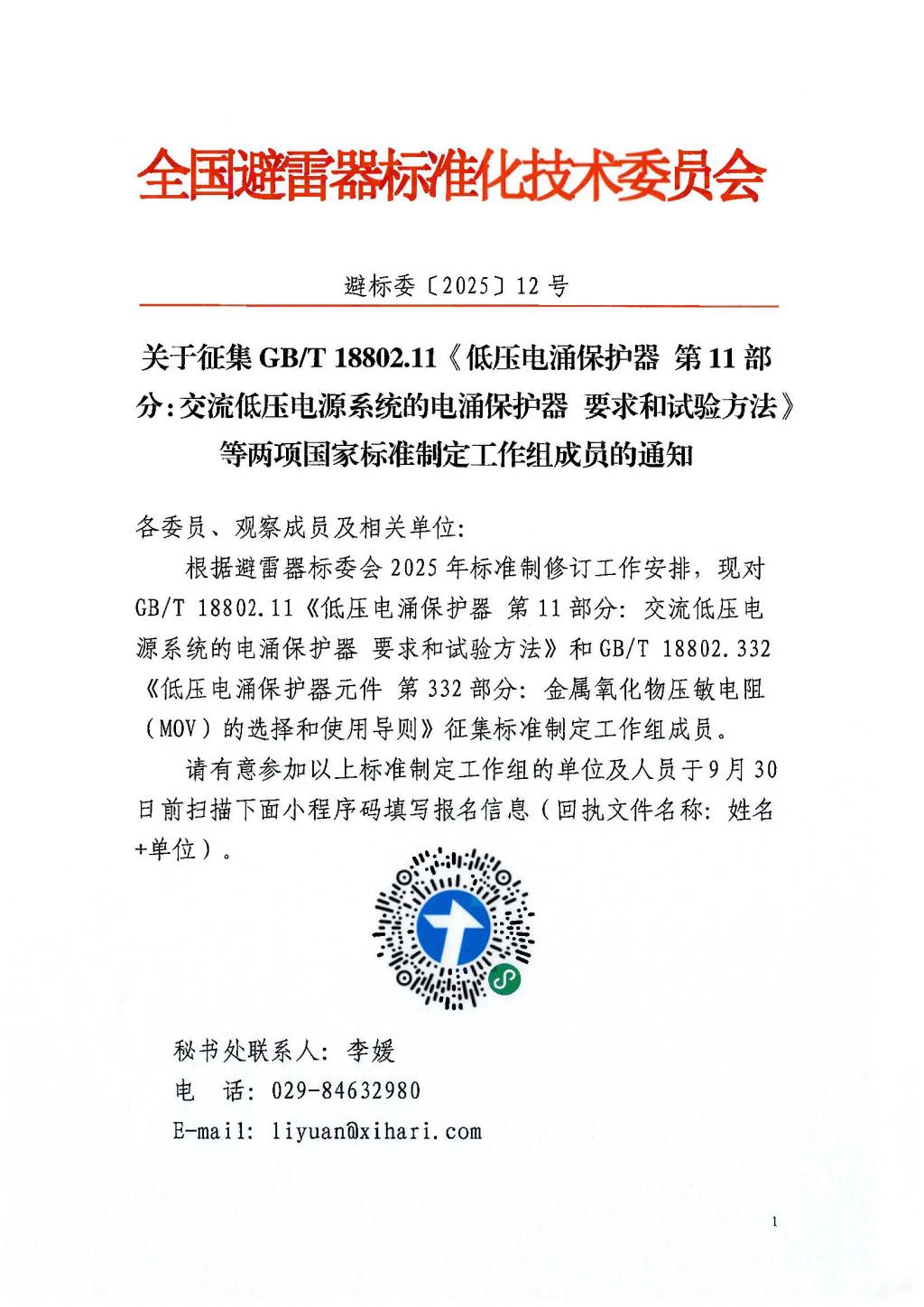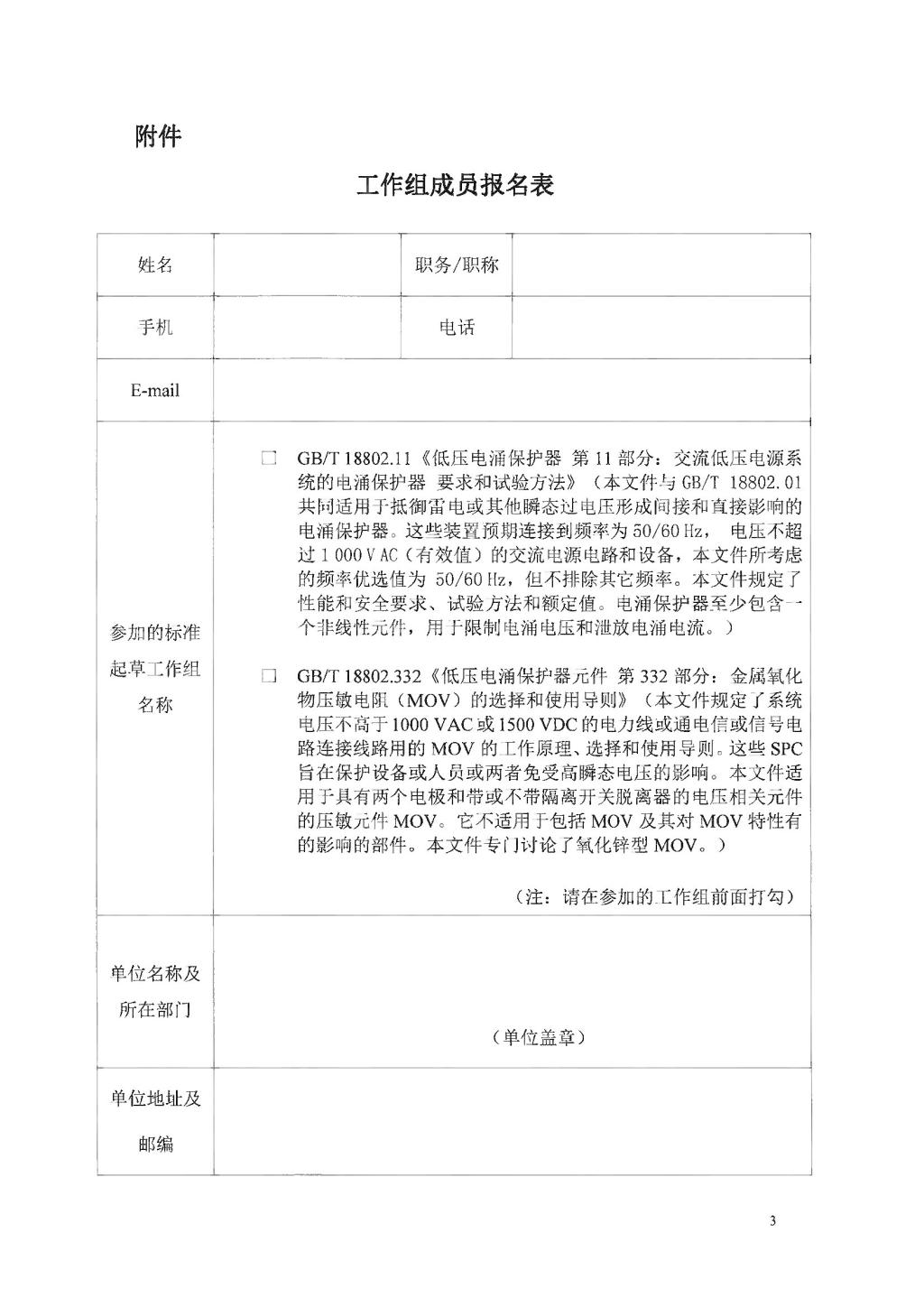 关于征集GB/T 18802.11《低压电涌保护器 第11部分:交流低压电源系统的电涌保护器 要求和试验方法》等两项国家标准制定工作组成员的通知