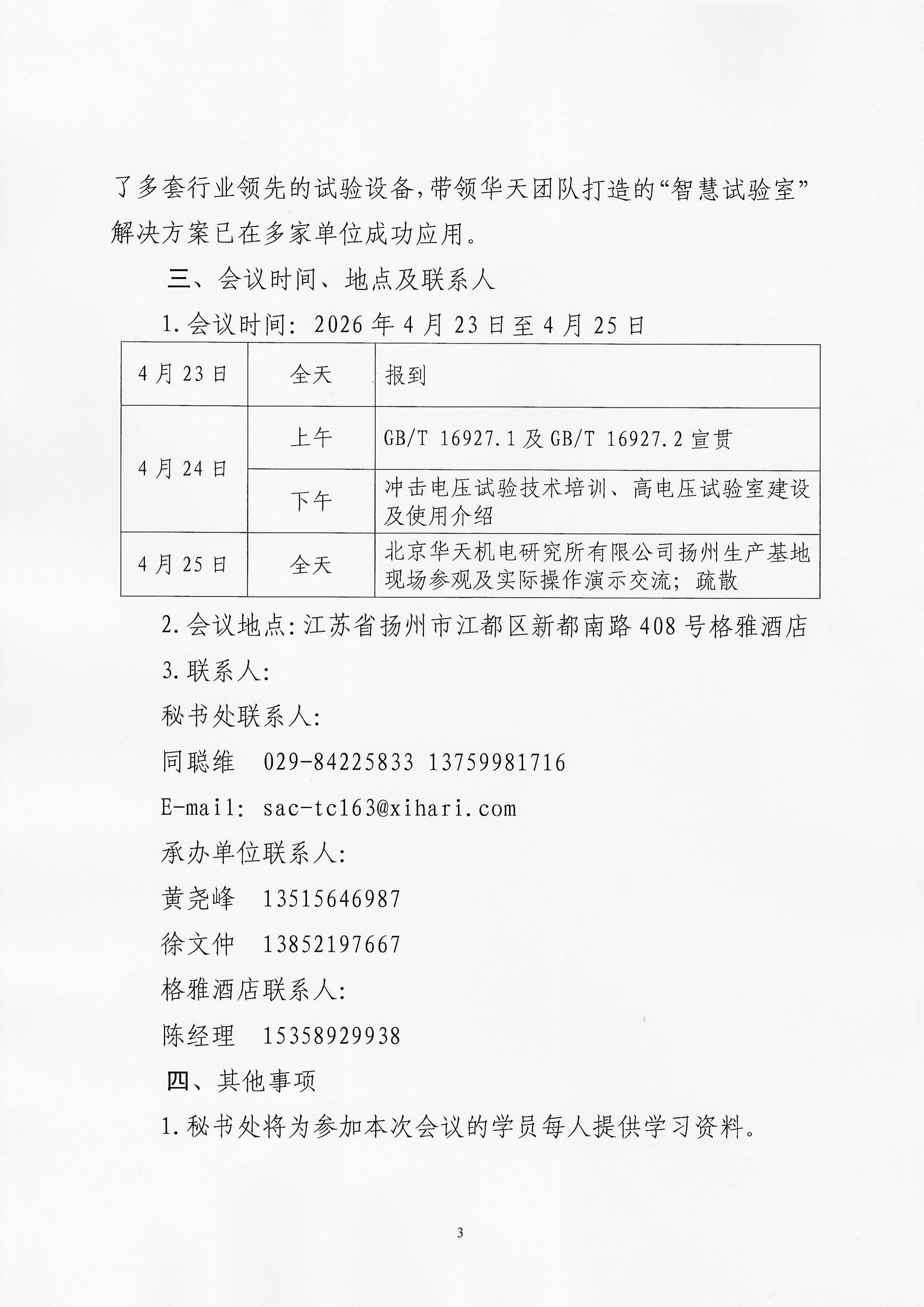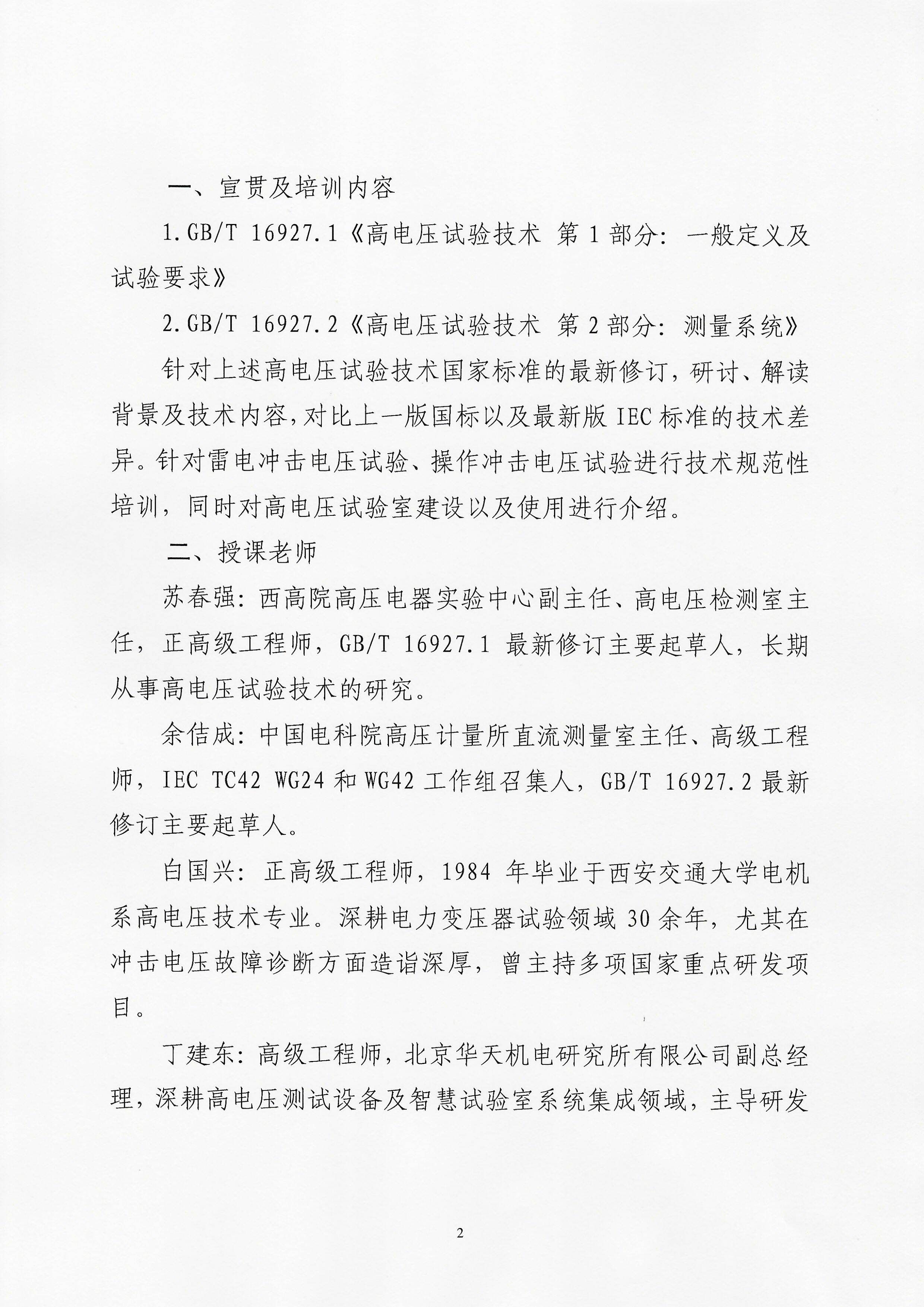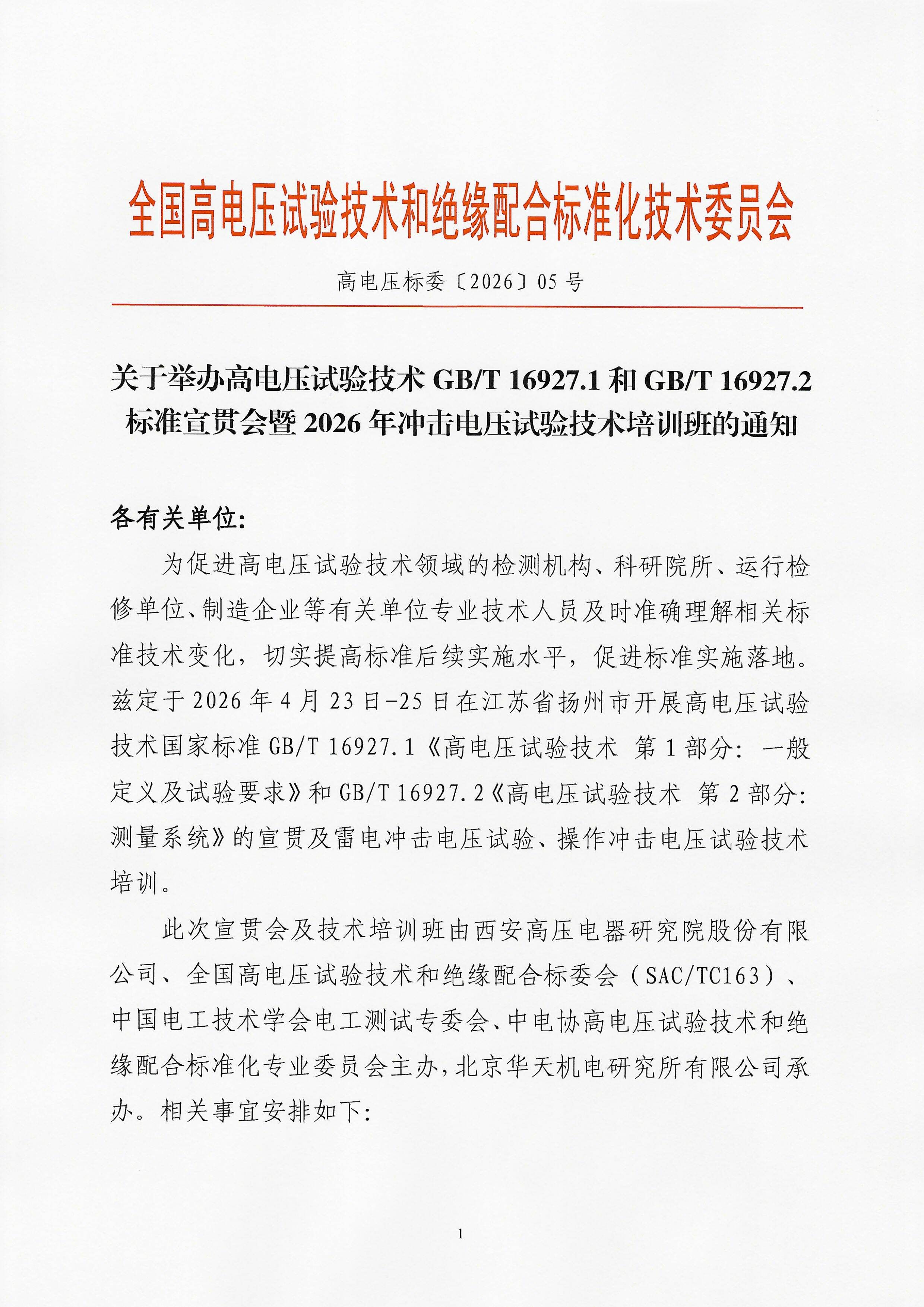 关于举办高电压试验技术GBT 16927.1和GBT 16927.2标准宣贯会暨2026年冲击电压试验技术培训班的通知